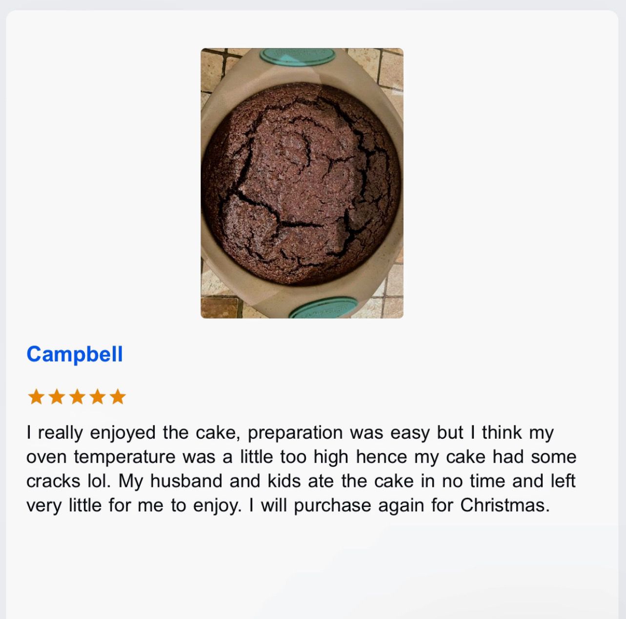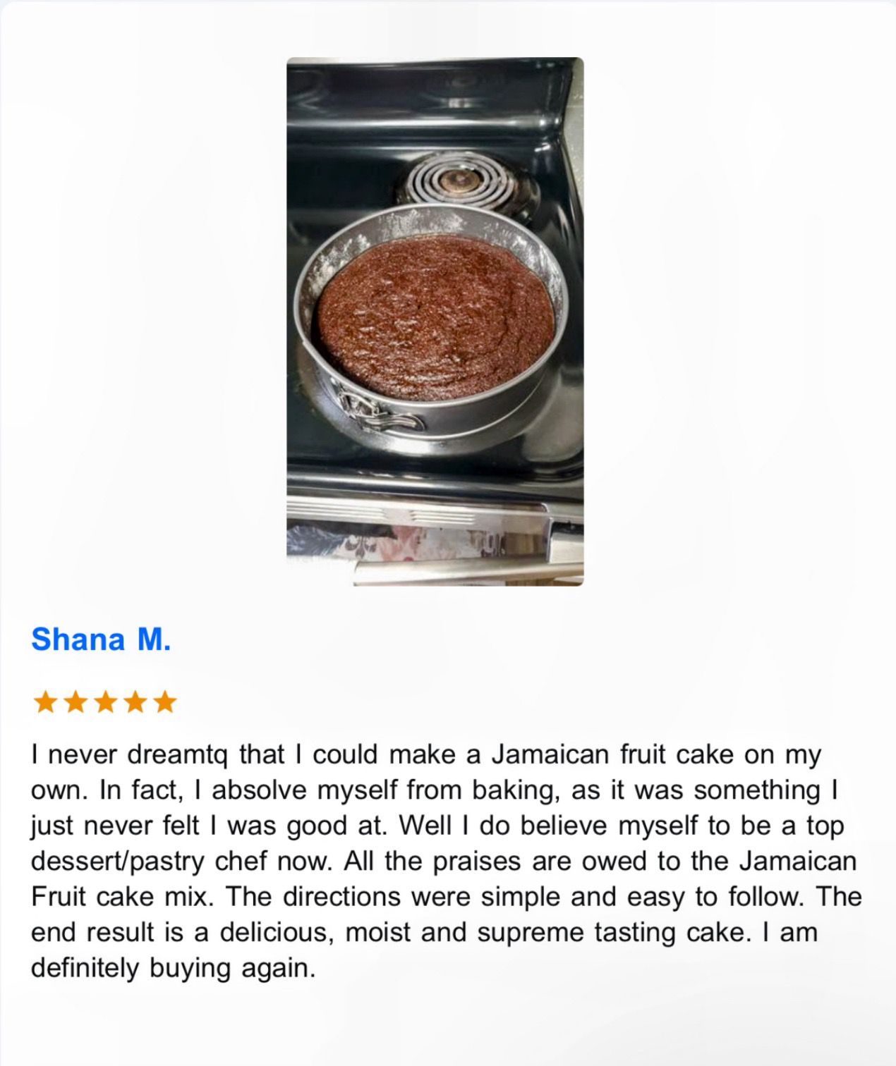 First off, this is the most delicious Jamaican rum cake I have ever tasted. It was incredibly simple to prepare and even a dummy like me made an exceptional birthday cake for my wife. Everyone was ranting and raving about it. Thank you for such a great product.