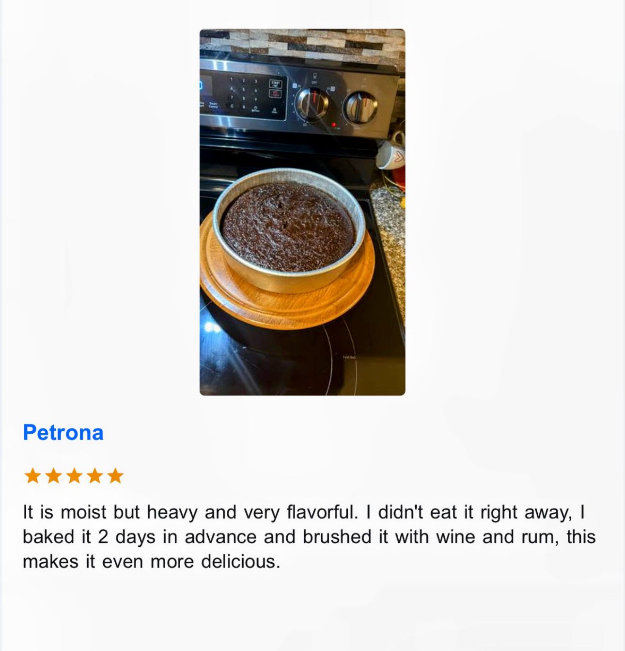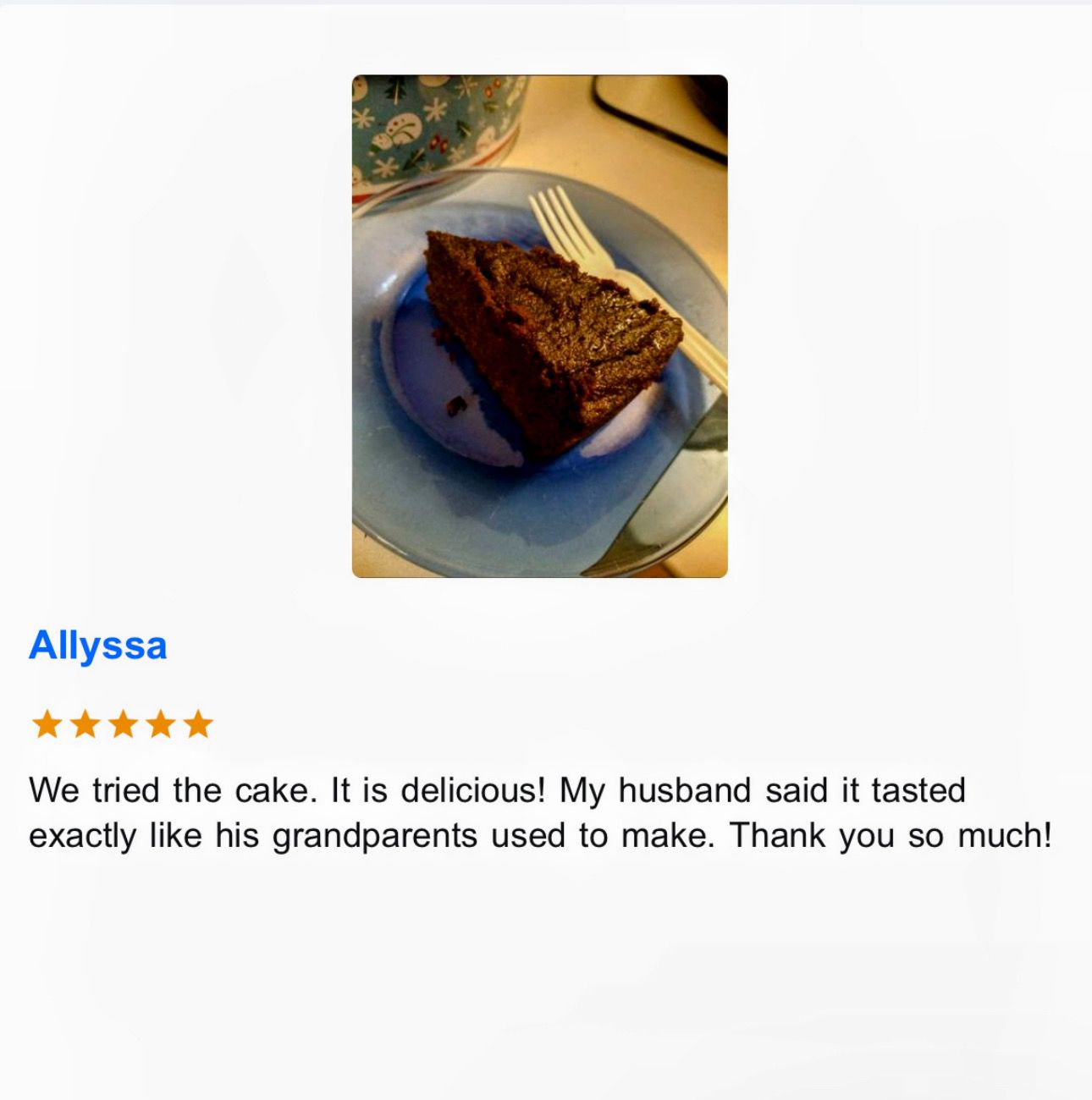 Buy this cake, you will not regret it! This is my second order, I ordered in December and now February again. It's just that good! The cake is perfect! Taste very authentic! This is the real Jamaican Black cake! 💯