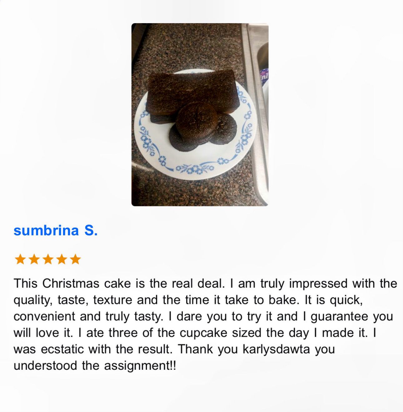 This Christmas cake is absolutely amazing! I’m beyond impressed by its quality, flavor, texture, and the short time it takes to bake. It’s quick, convenient, and incredibly delicious. I couldn’t be happier with the outcome. Thank you, karlysdawta, for nailing it!"